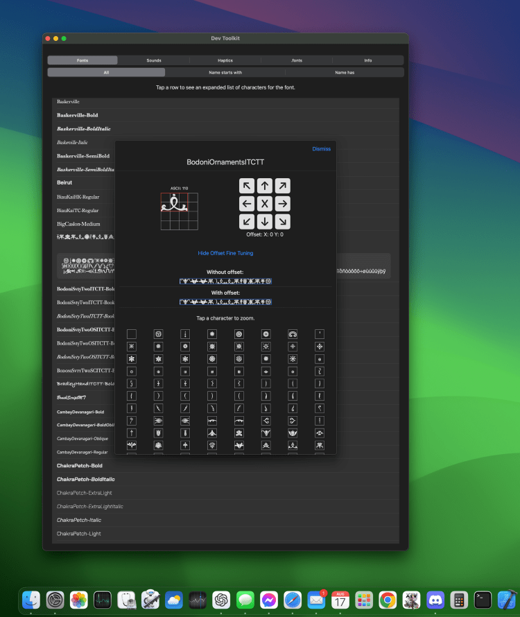 - Fonts: A comprehensive display of all fonts available for use on iPhones, iPads, and Macs, with detailed character summaries and CGSize offset settings for perfect positioning.
