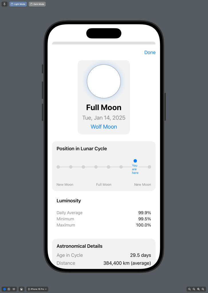 The app uses a public web service to determine the various light phases for a particular location, but could, at scale, overwhelm the web service with API calls. But wouldn’t it be cool if the app calculated those phases locally? Could AI write that? “I’d love to,” it responded.